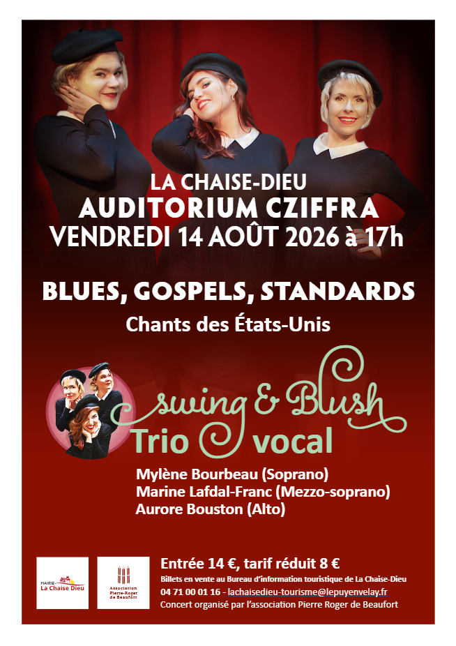 Invité par l’association Pierre Roger de Beaufort pour un concert à l’auditorium Cziffra le vendredi 14 août 2026 à 17h, l’ensemble Swing & Blush est un trio vocal a cappella composé de jeunes chanteuses lyriques professionnelles.